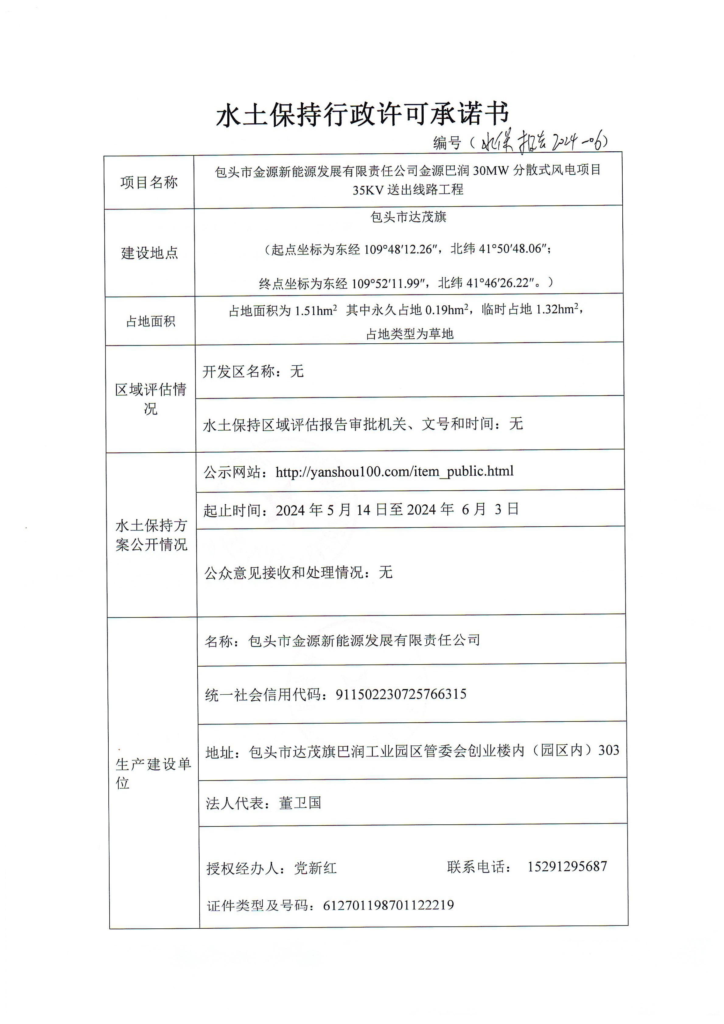 包头市金源新能源发展有限责任公司金源巴润30MW分散式风电项目35KV送出线路工程水保承诺书
