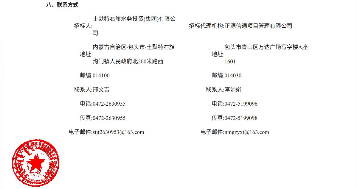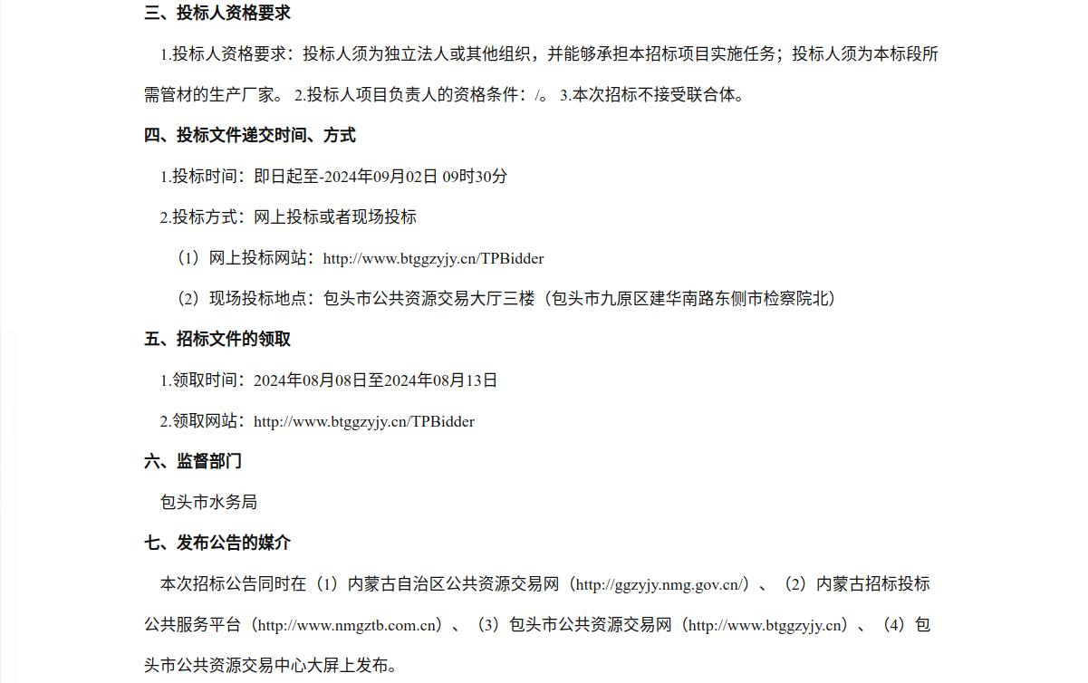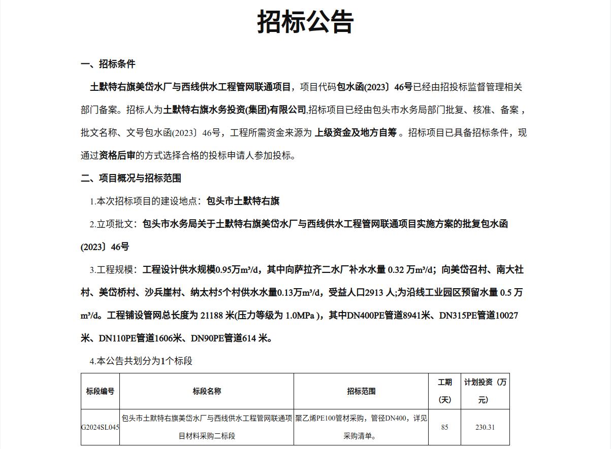包头市土默特右旗美岱水厂与西线供水工程管网联通项目材料采购二标段
