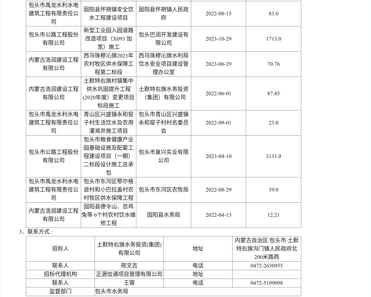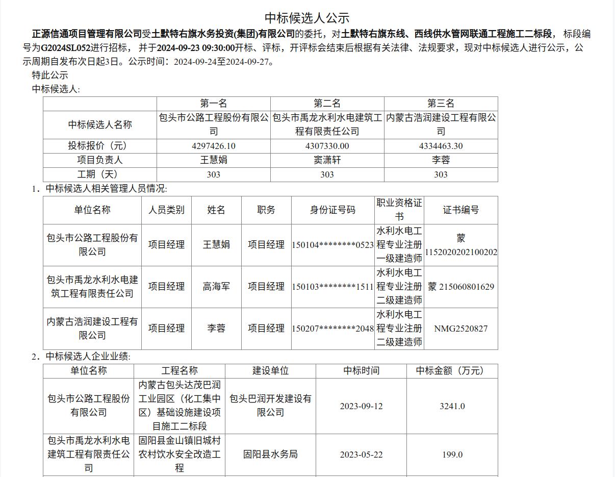 土默特右旗东线、西线供水管网联通工程施工二标段中标候选人公示