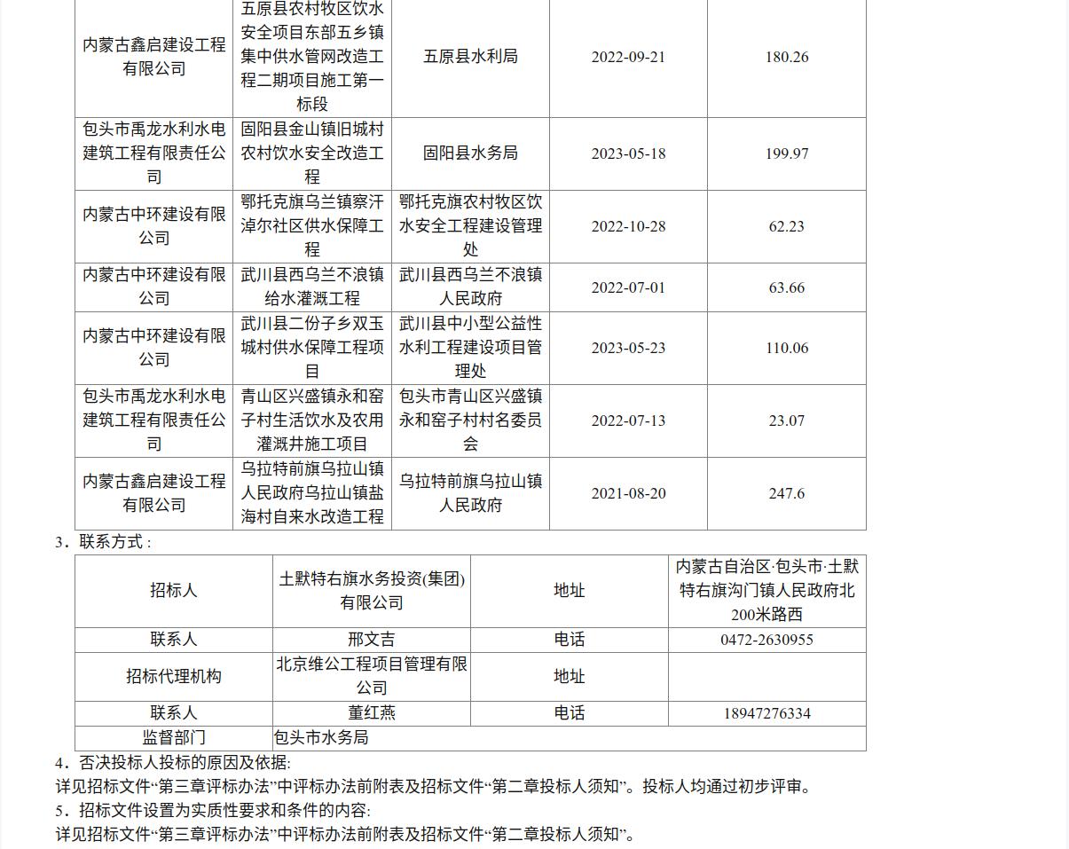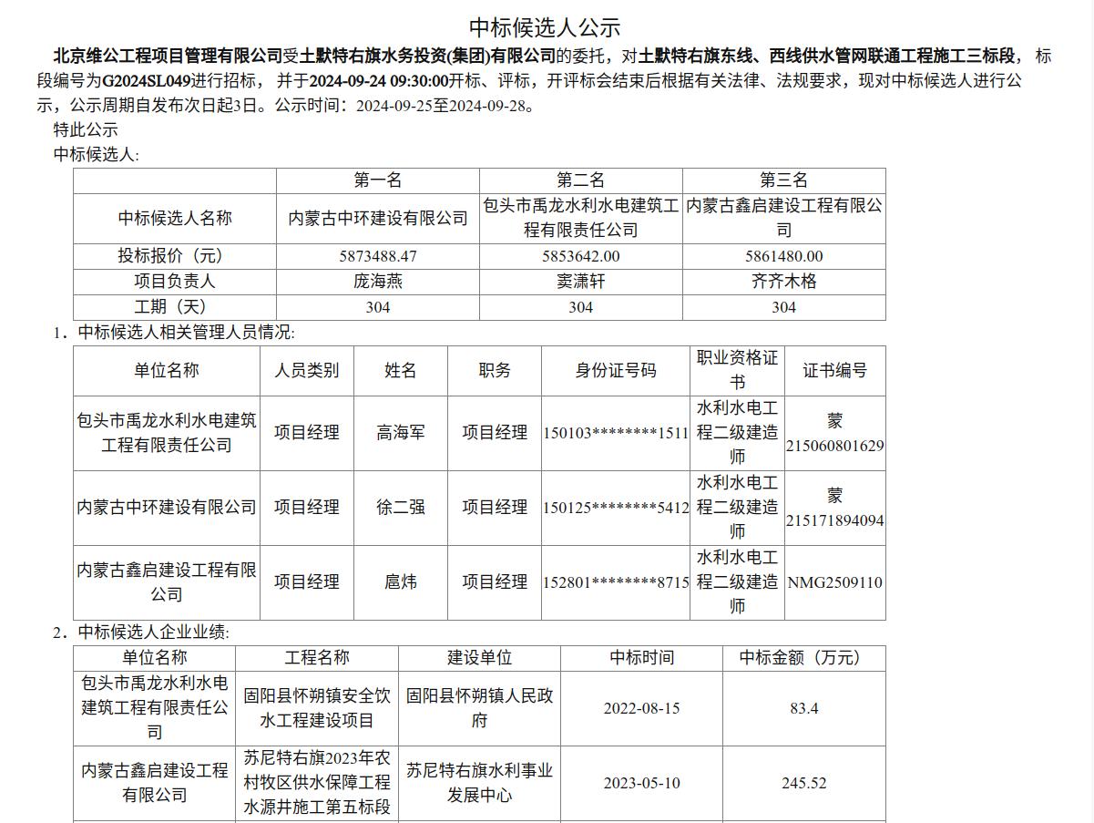 土默特右旗东线、西线供水管网联通工程施工三标段中标候选人公示