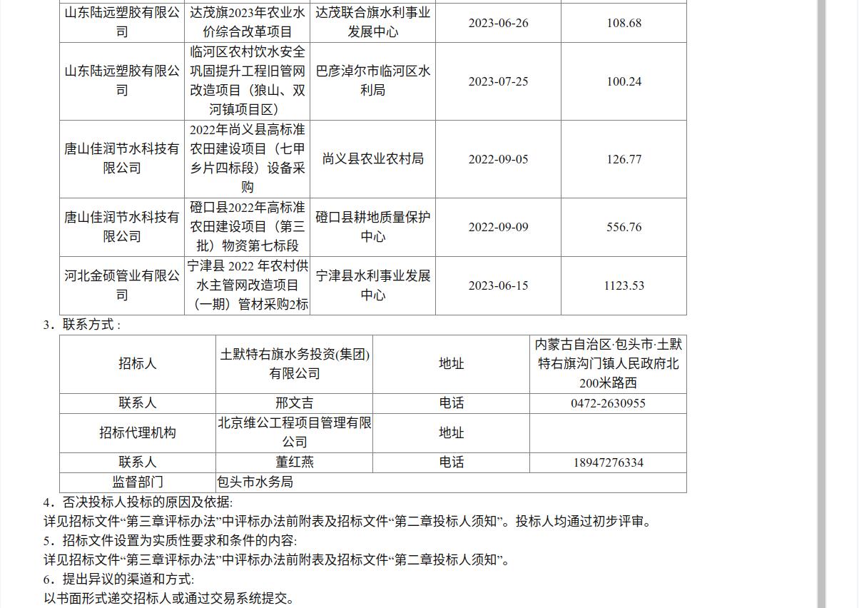土默特右旗东线、西线供水管网联通工程材料采购二标段中标候选人公示
