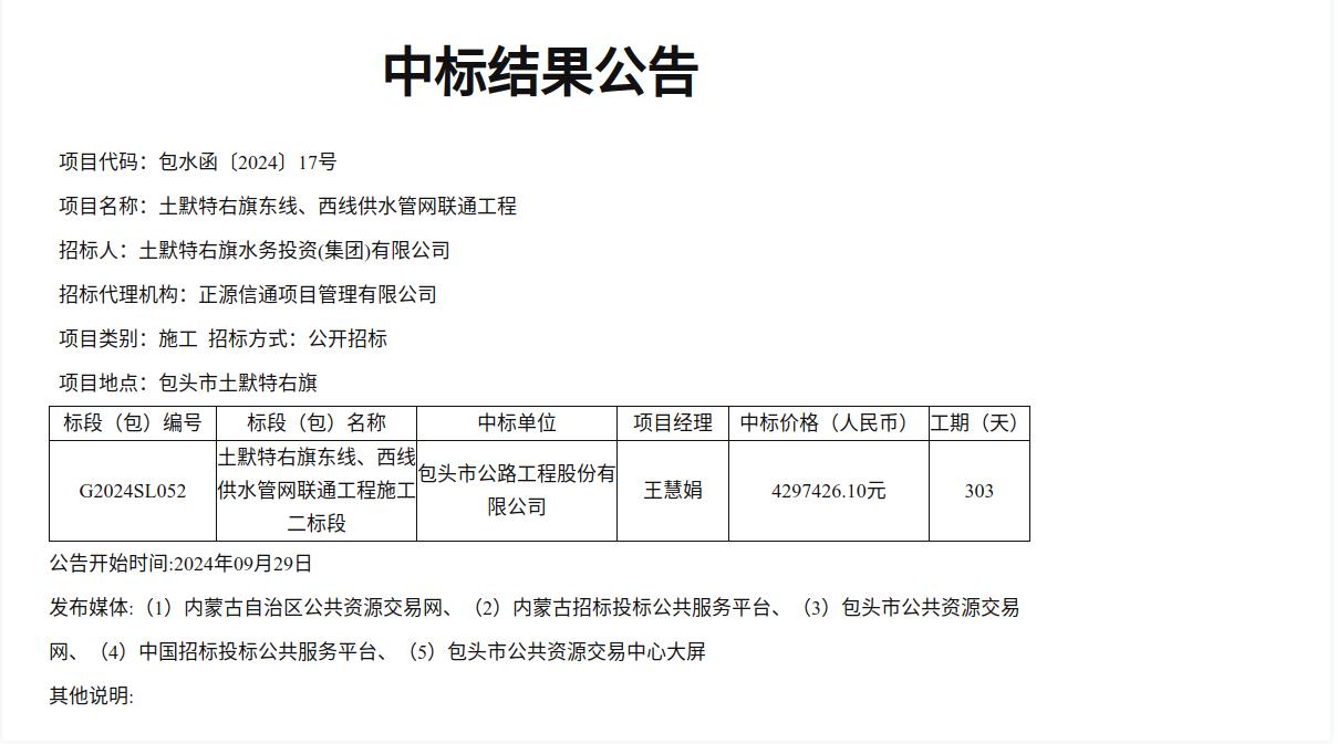土默特右旗东线、西线供水管网联通工程施工二标段